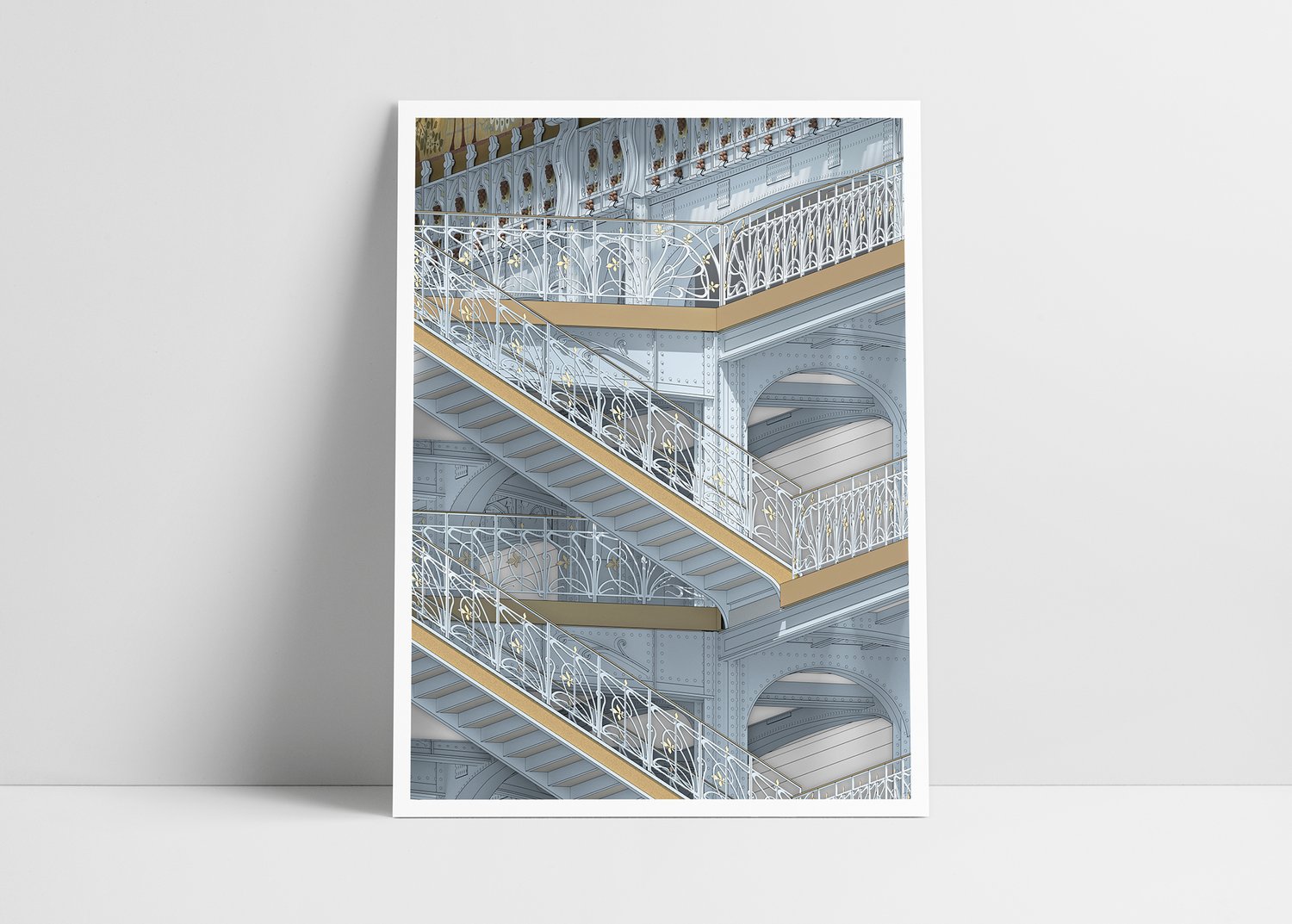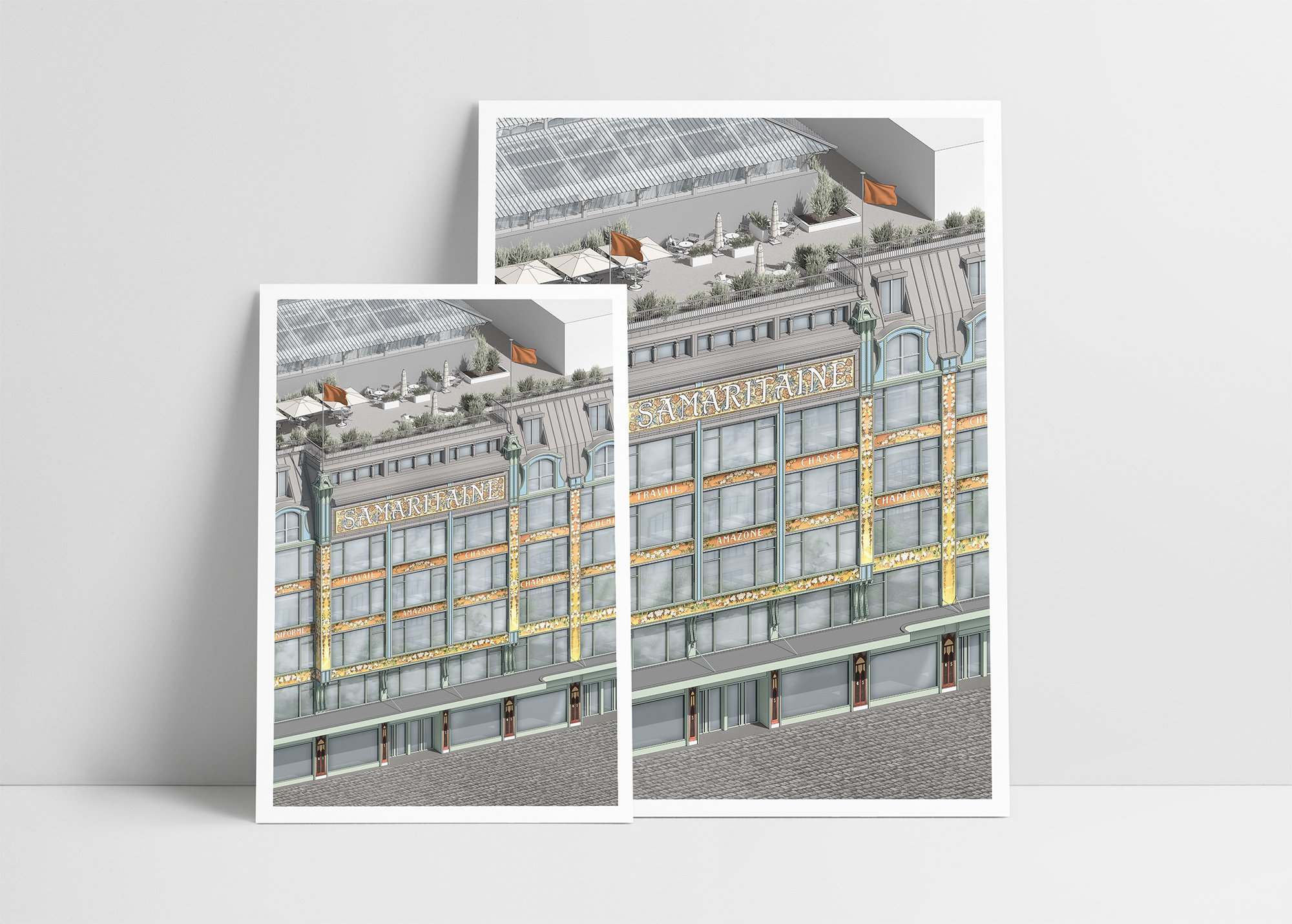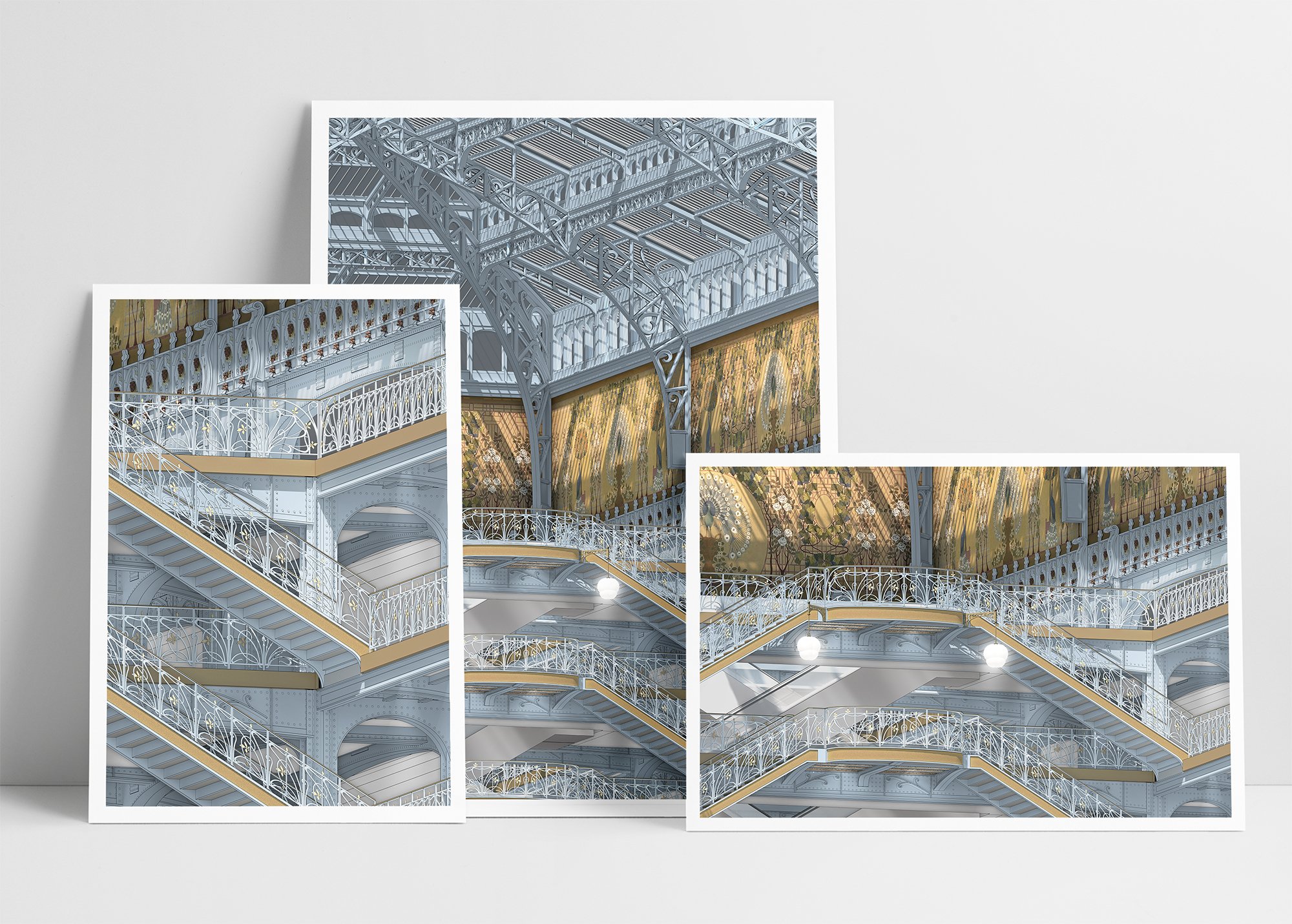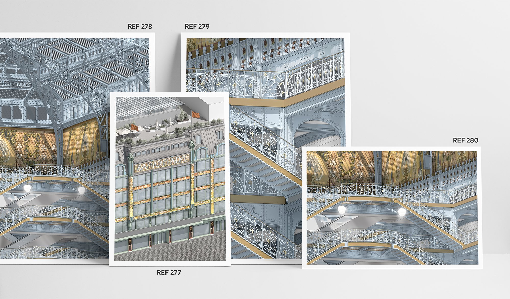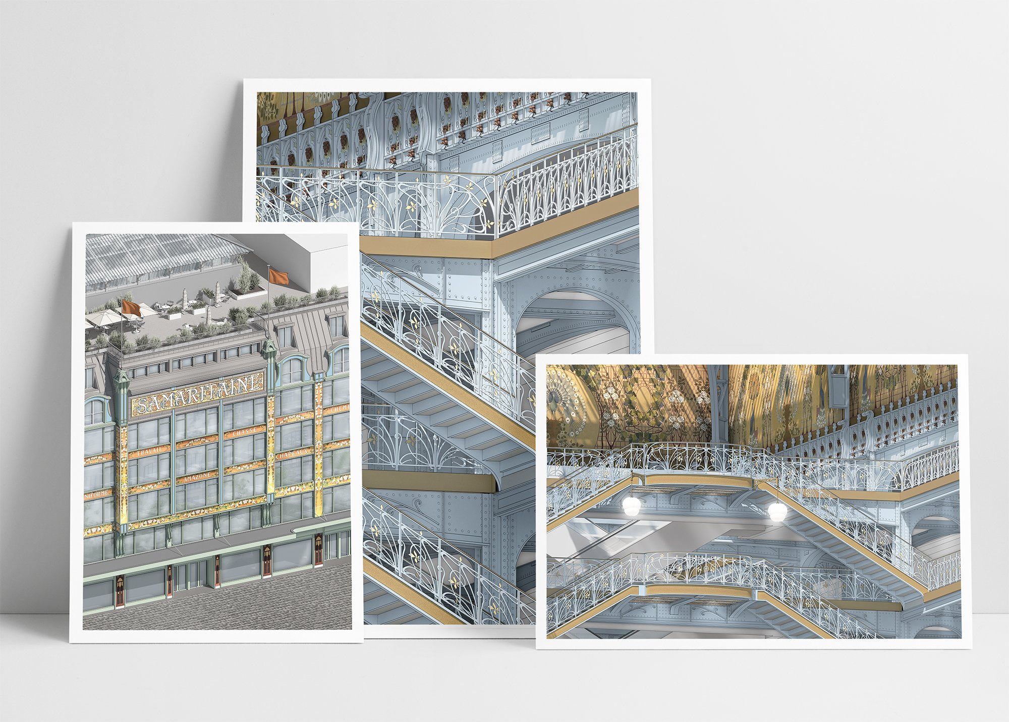 Illustration de la façade et l'escalier de la Samaritaine à Paris, réalisée en 3D et exportée pour impression.